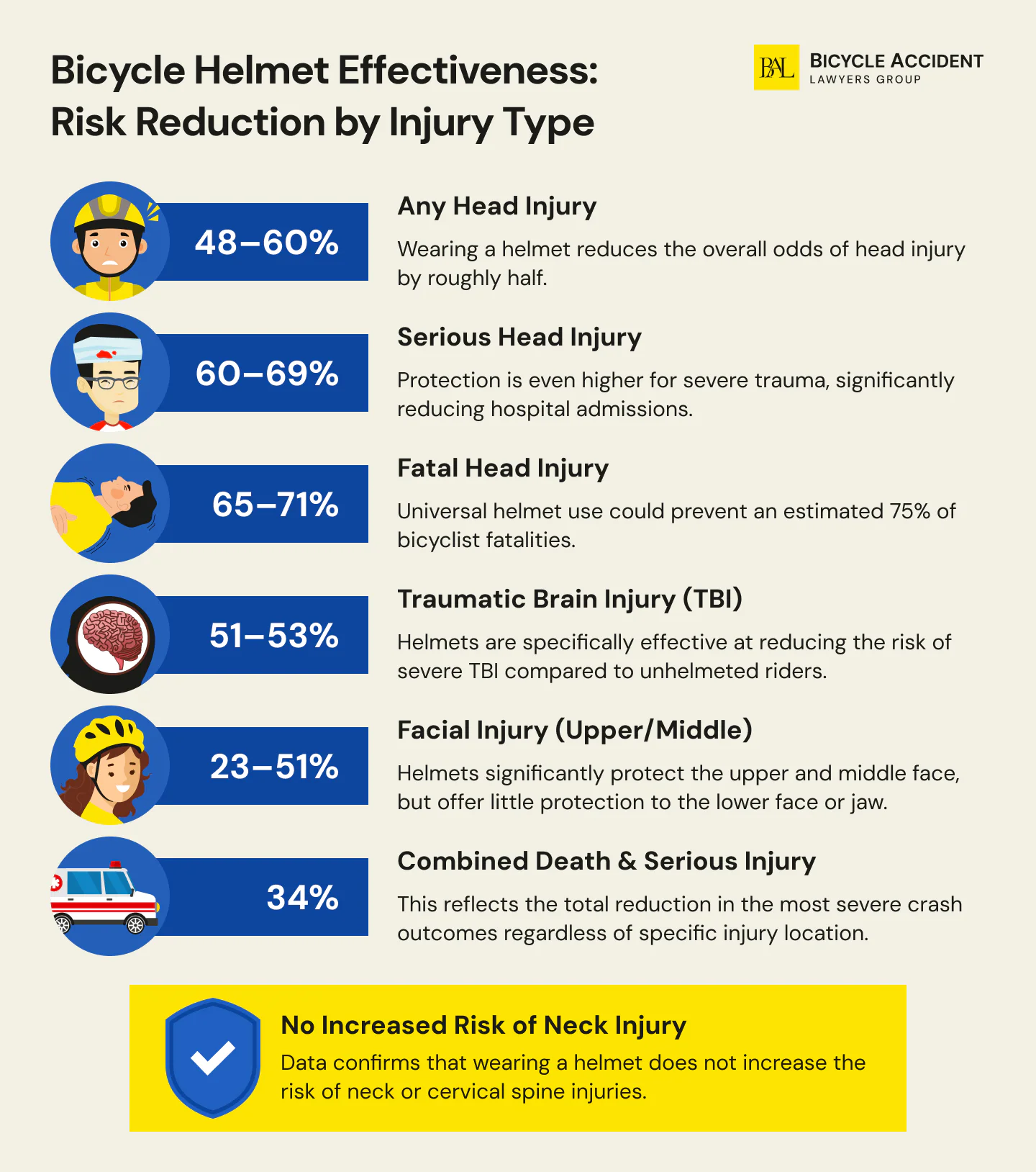 | Fatal Head Injury | 65 to 71% | Universal use could prevent an estimated 75% of cyclist fatalities. |