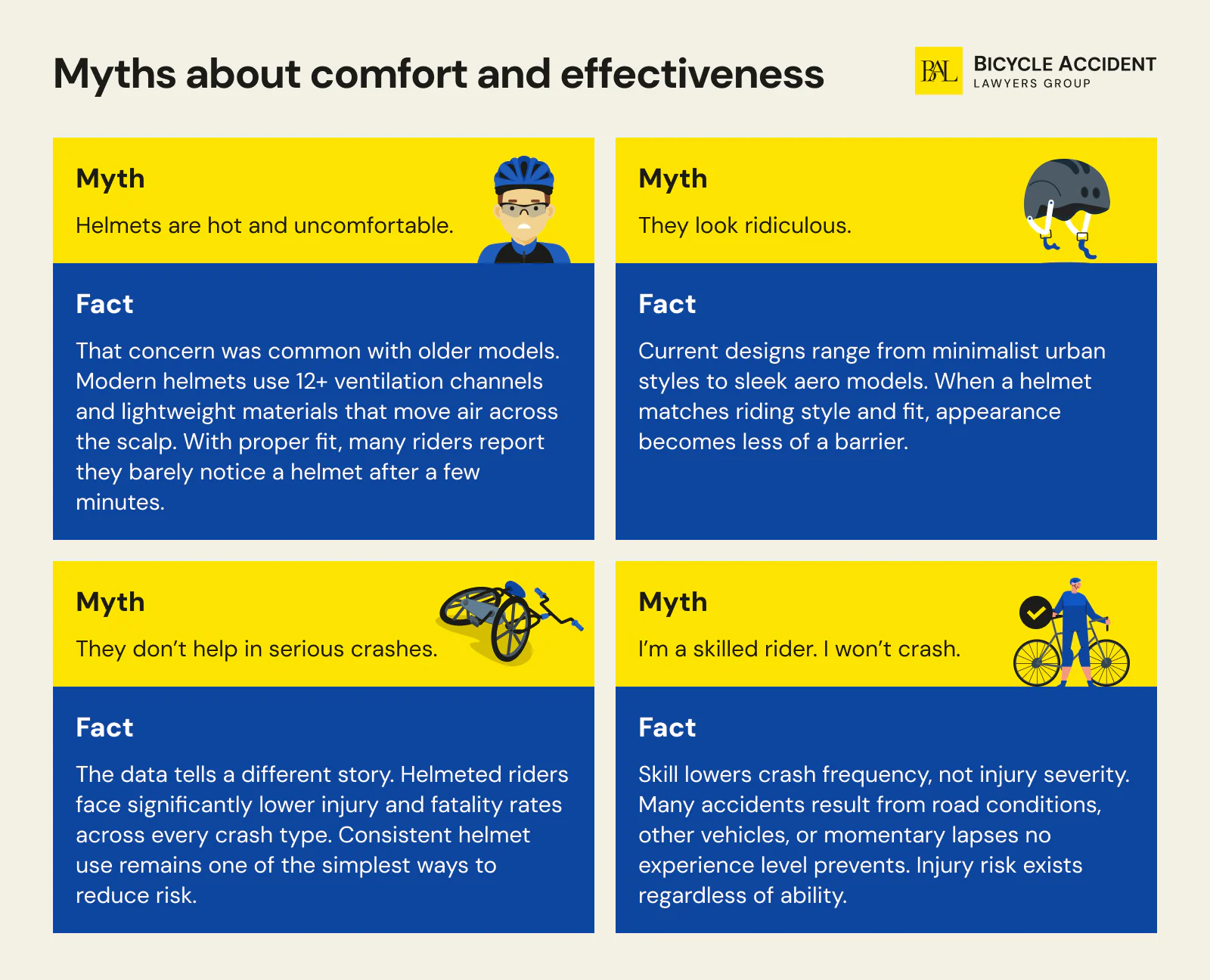 “I’m a skilled rider. I won’t crash.” Skill lowers crash frequency, not injury severity. Many bicycle accidents result from road conditions, other vehicles, or momentary lapses that no experience level prevents. The risk exists regardless of your ability.