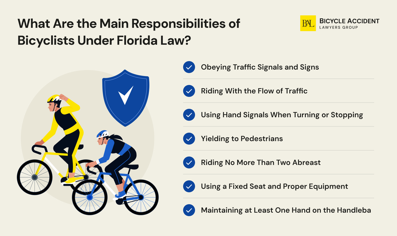 All the main traffic laws apply to bicyclists in the Sunshine State. They are designed not only to keep cyclists and other road users safe, but also to avoid citations and liability should an accident occur.